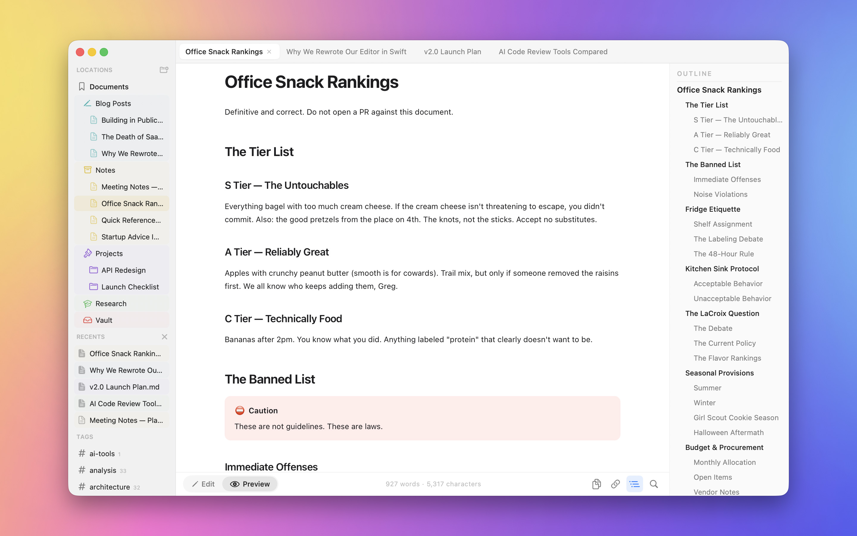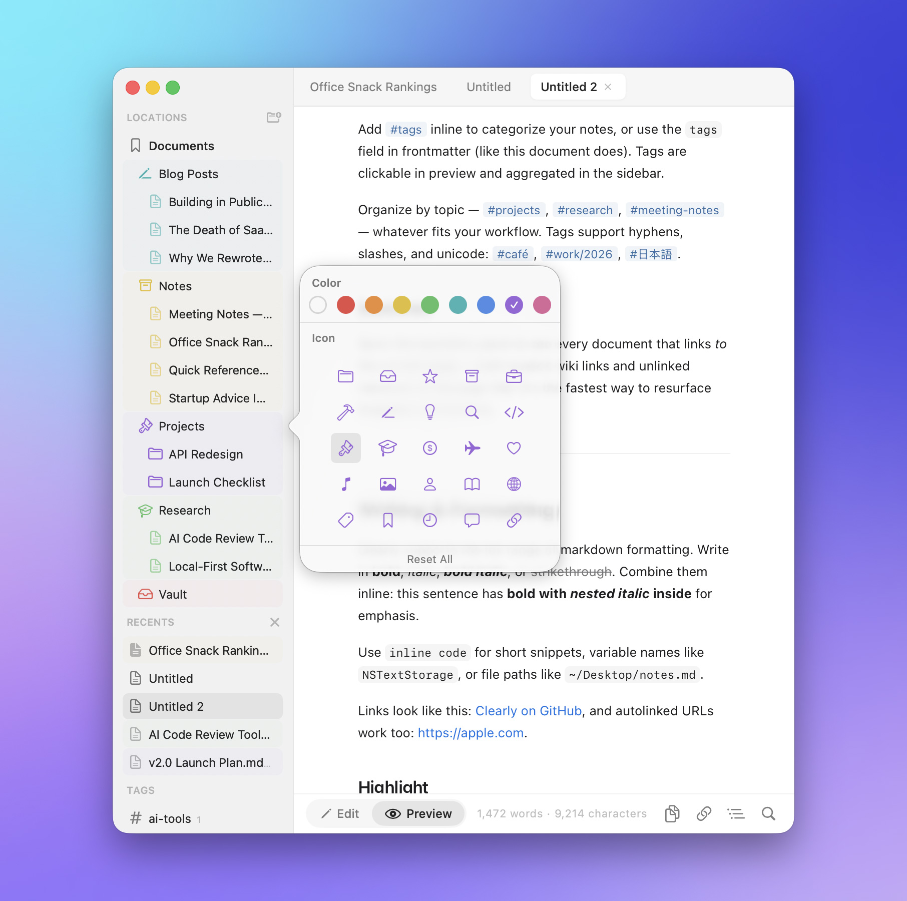A native markdown editor and document workspace for Mac. Open folders, browse your files, write with syntax highlighting, and preview instantly.