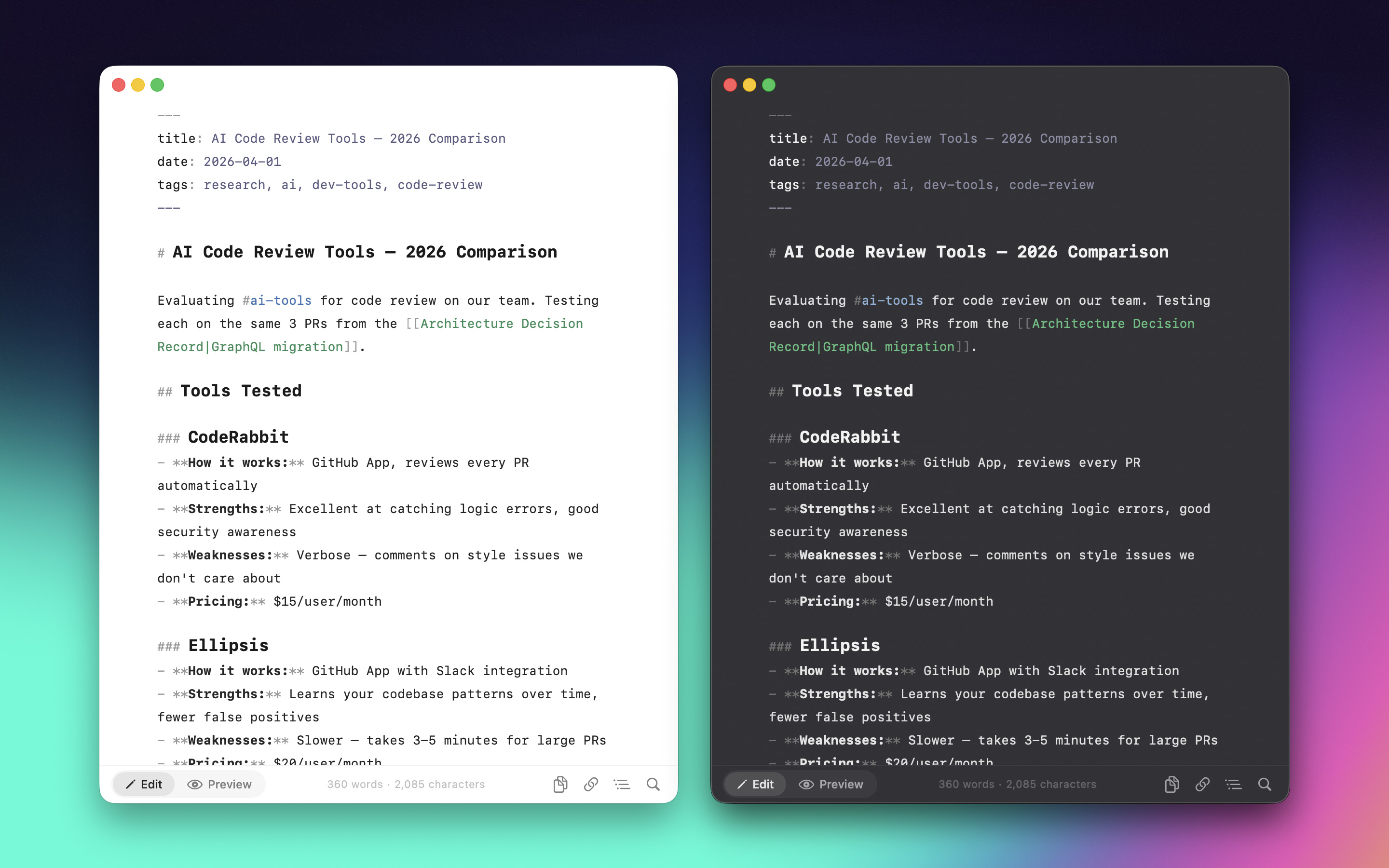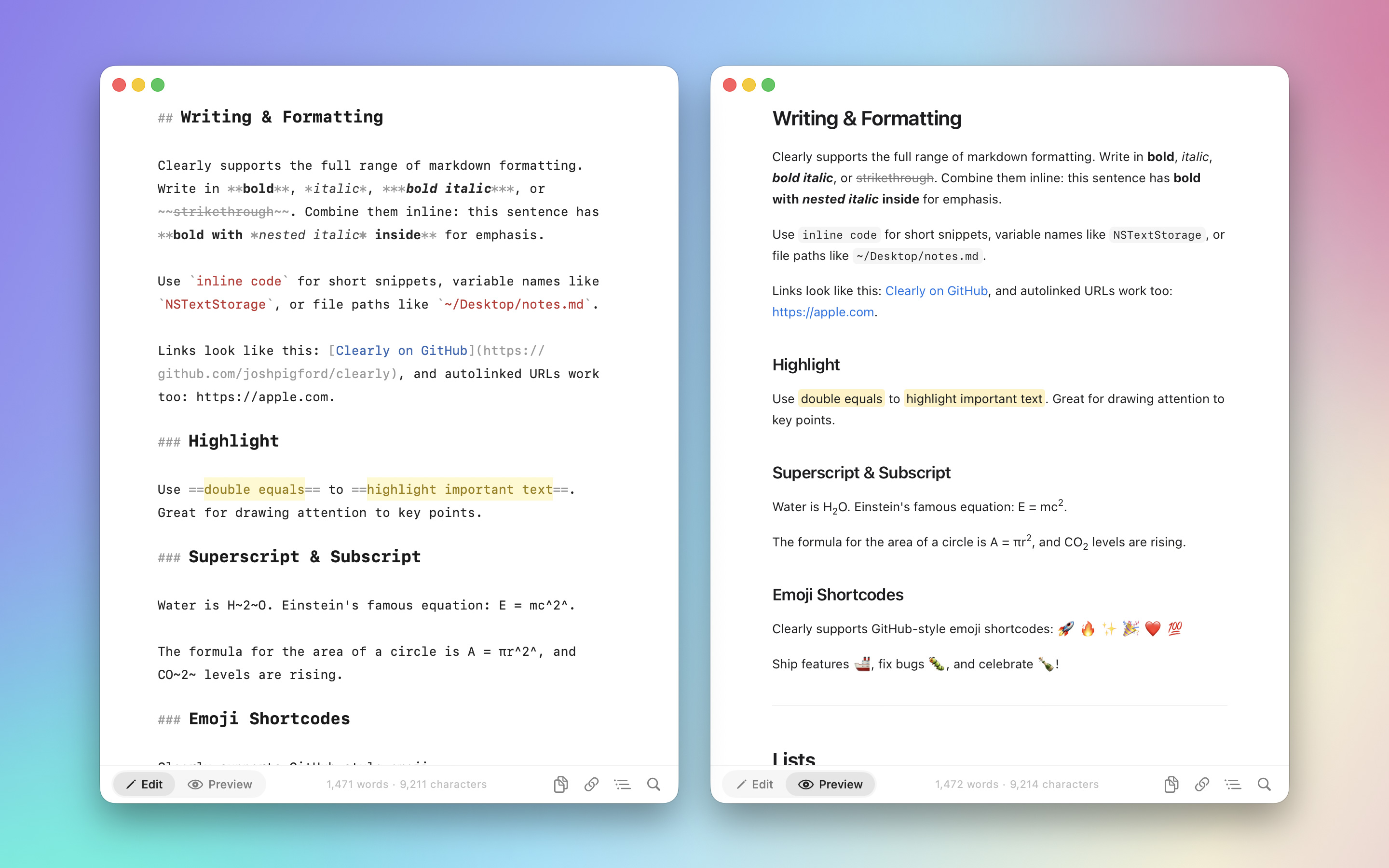 Switch between writing and reading with ⌘1 and ⌘2. Scroll position stays in sync across both.