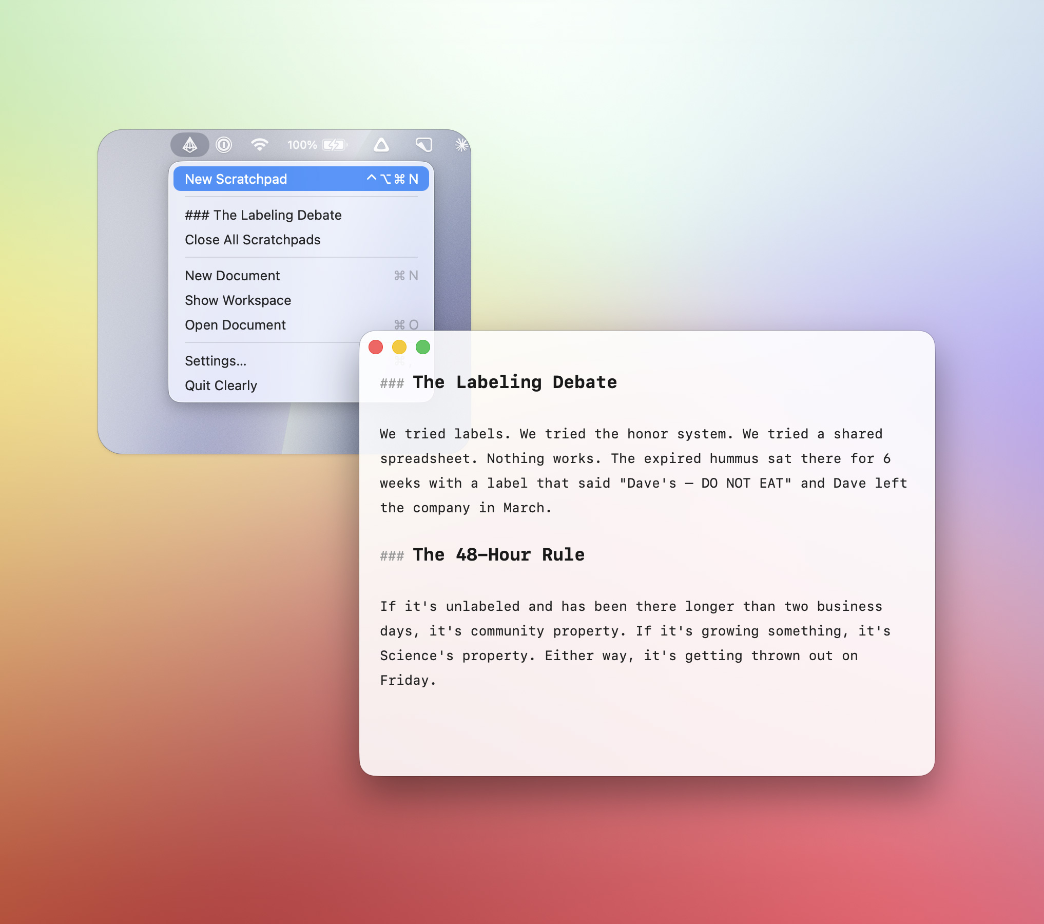 A menubar app with a global hotkey for jotting things down. Capture a thought without opening a full document.